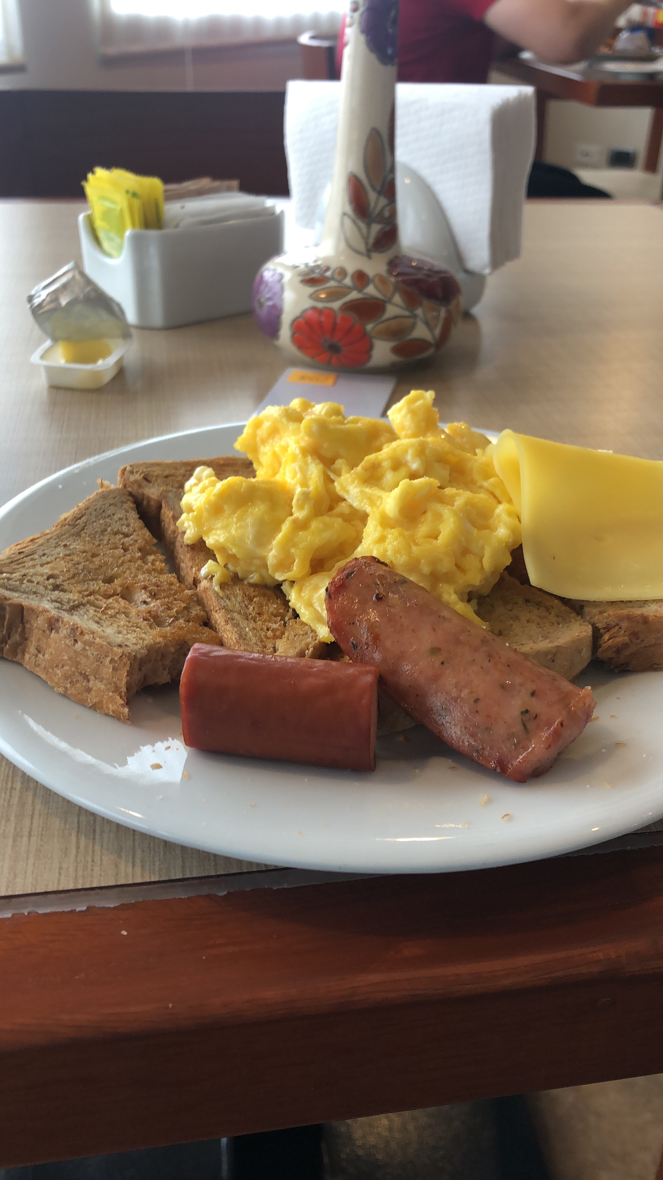 2 slices of brown bread into the toaster, freshly squeezed orange juice from the machine, a little pat of butter, 2 slices of Edam cheese, 2 slices of turkey meat (I chose turkey over ham as I was watching the calories intake 🤣), 2 spoons of diced mango, 2 spoons of diced pineapple, 1 slice of watermelon, 2 heaped spoons of scrambled egg, 2 types of sausage, a wee pot of jam and the all important cup of tea – life was good!