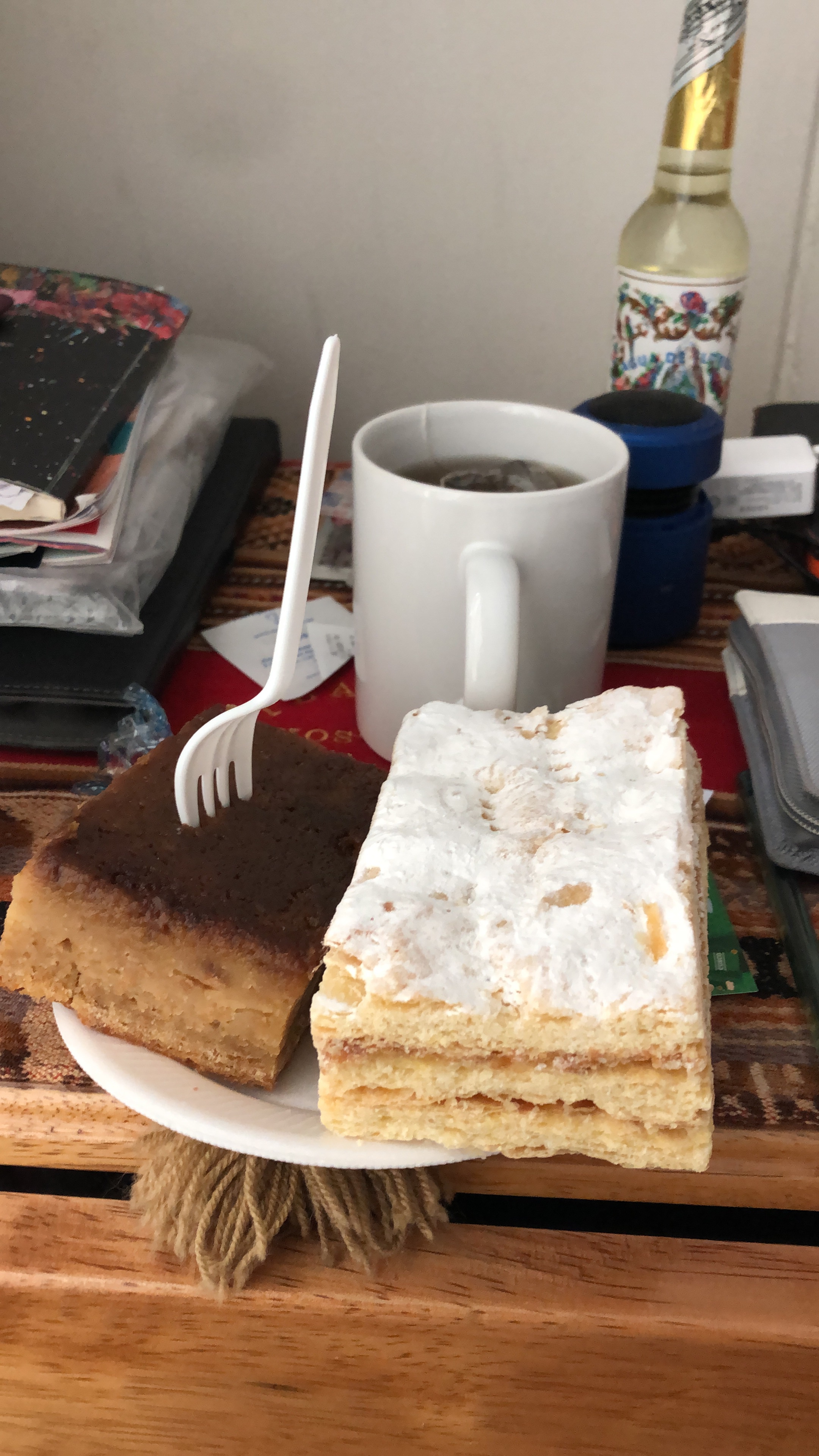 I put the mug of tea on the bedside table beside the cakes, climbed back into bed and as turned to pick up my cake and OMG, I misjudged it and both cakes fell on the floor and scattered everywhere.