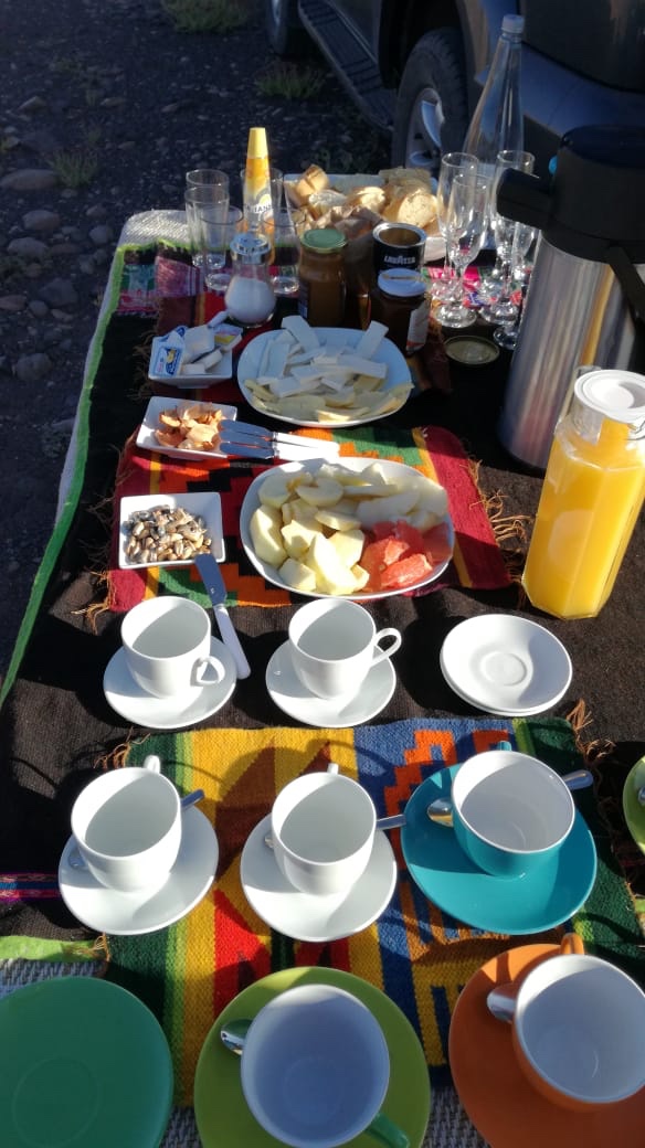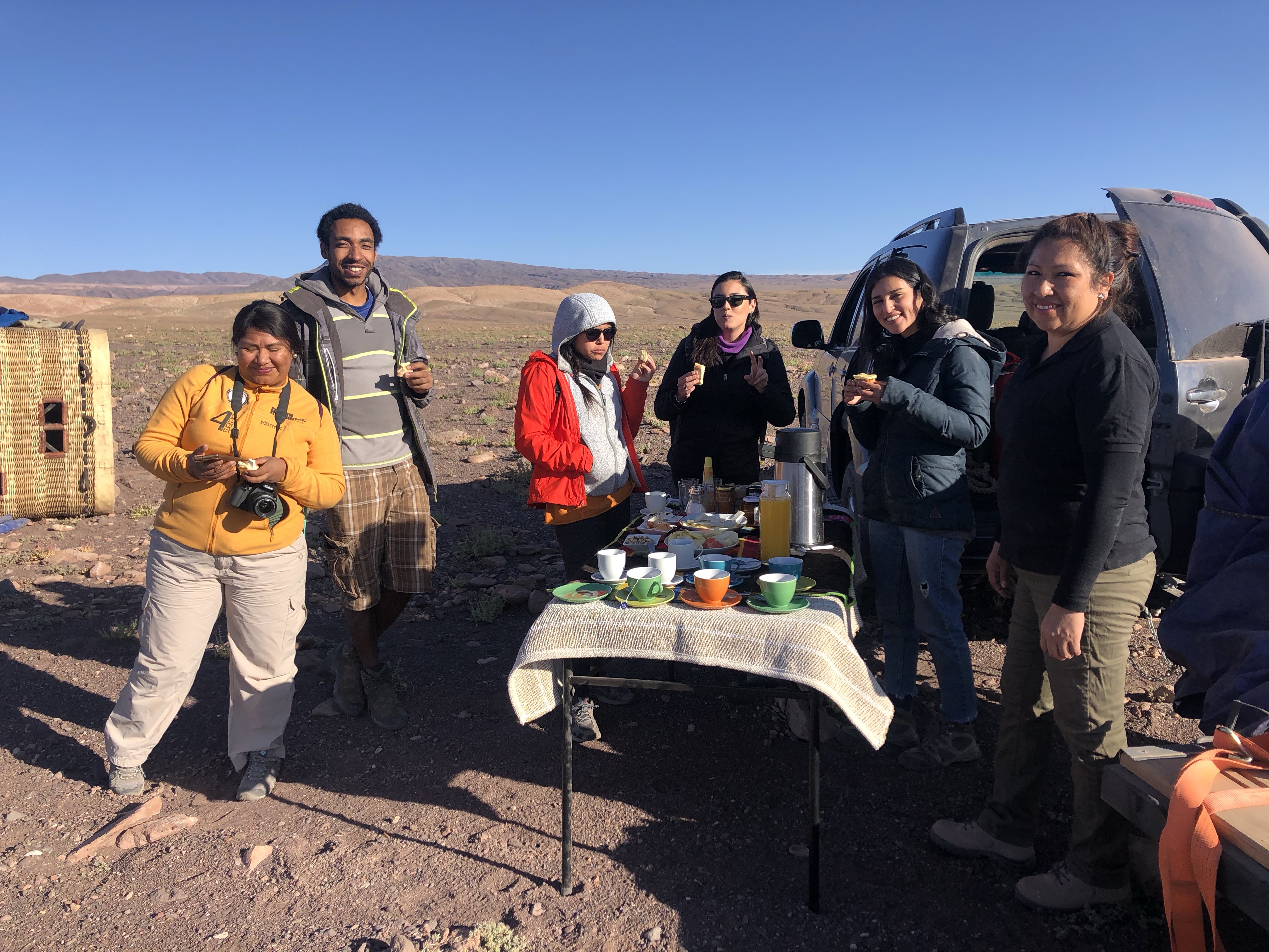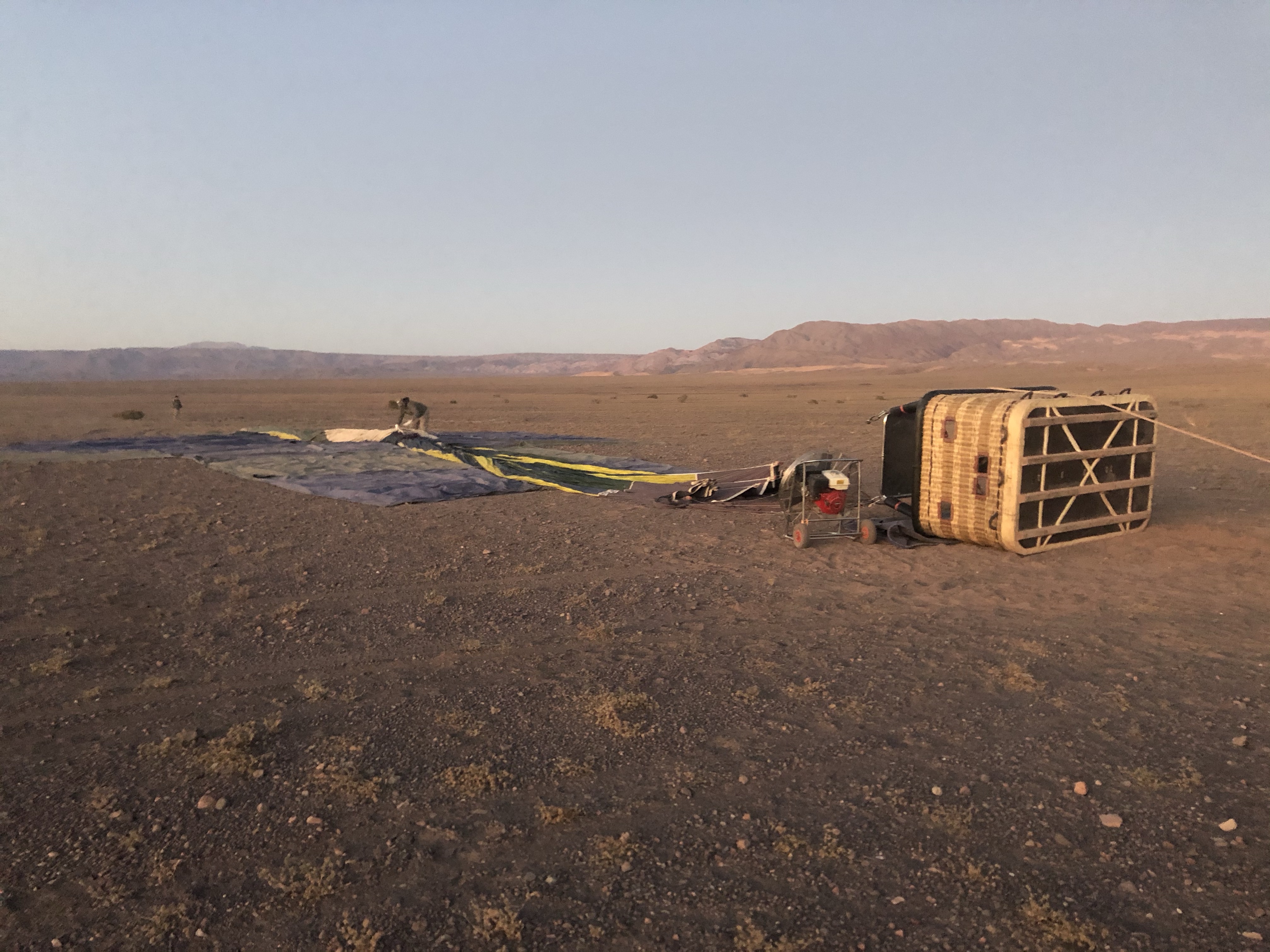 After reluctantly climbing out of the basket we were treated to an unexpected breakfast. In the silence of the desert we watched the staff efficiently deflate the gargantuas balloon as we relaxed and drank orange juice, ate delicious cheese sandwiches, munched on fresh fruit and I had that all important cup of tea the leaves of which were grown locally (rica rica).