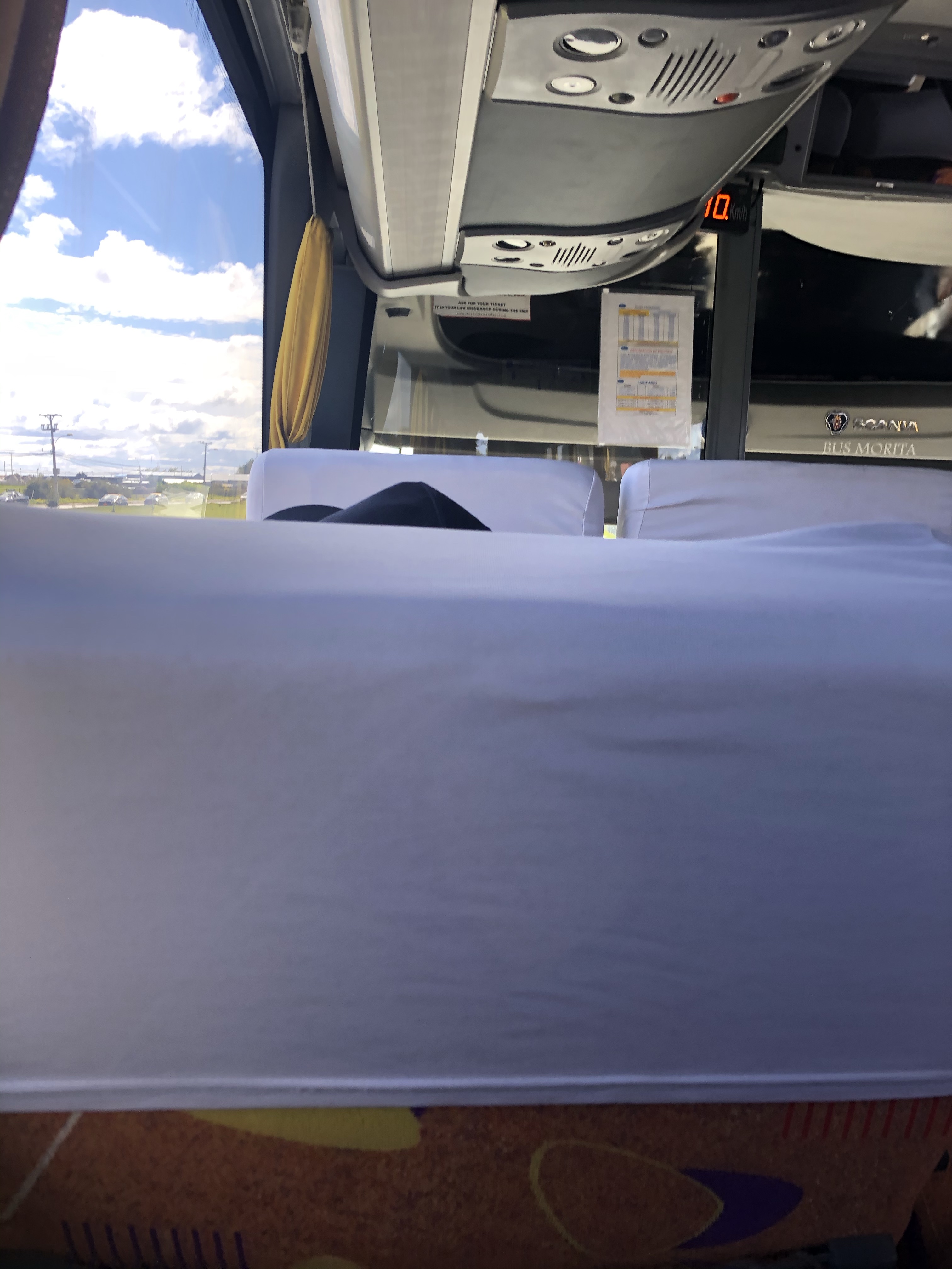 Just my bloody luck, I had the most rubbish seat in the whole bloody bus. I have no window and the person in front has reclined his seat so bloody far back and I now feel as though I am in a tiny wee box – and we’re not even out of the bus station!