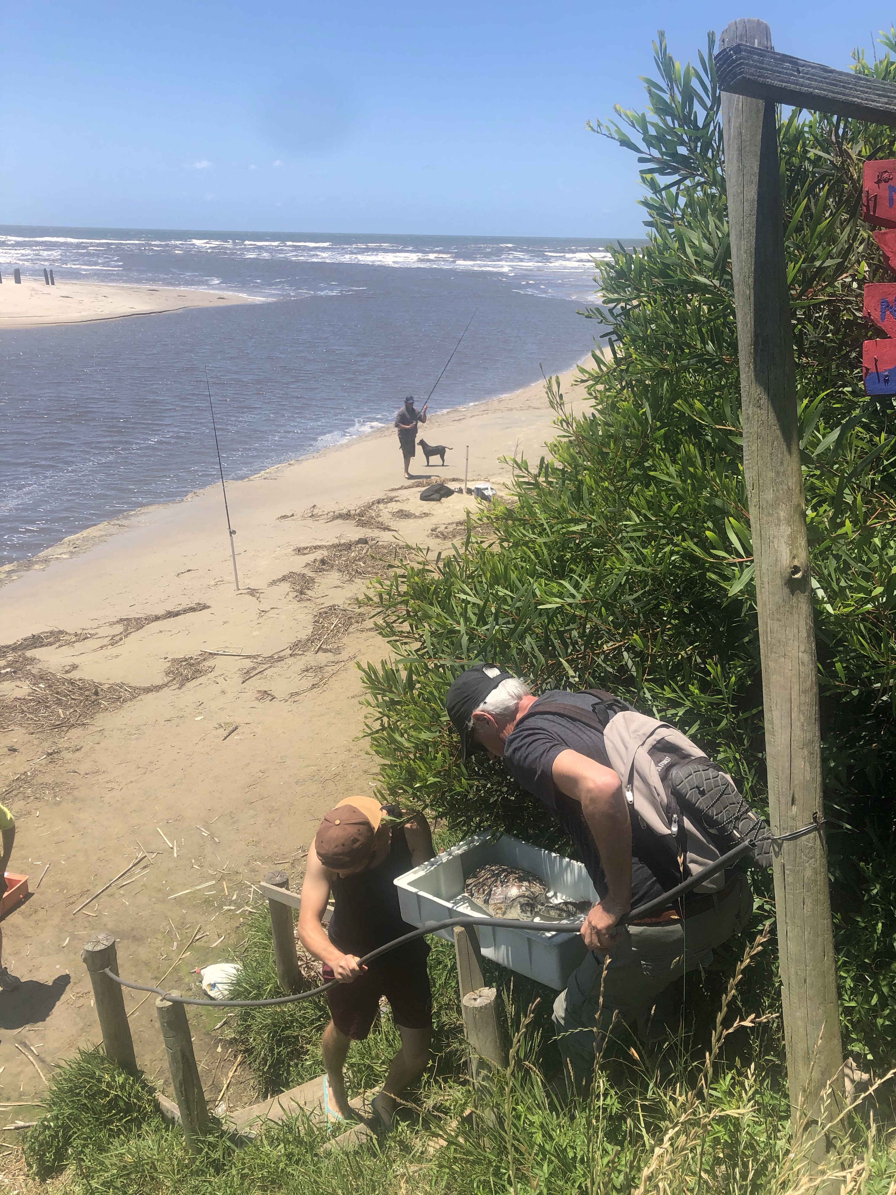 Crossing the swing bridge was difficult as it was very mobile so it was decided that the person carrying each turtle cross over individually. it was amazing to see the turtles get so excited the nearer we got to the ocean – they popped their heads over the boxes, I’m sure they were sniffing the air and listening to the waves crash upon the shore