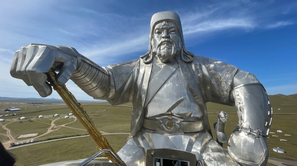 After finishing our city tour, we headed to the bank of the Tuul River, 34 miles east of UB, to visit the enormous statue of Genghis Khan on his equally enormous horse, rising 40m high. The statue sits on the Genghis Khan Statue Complex, an architecturally impressive visitor centre with 36 coloumns representing the 36 khans from Genghis to Ligdan Khan.