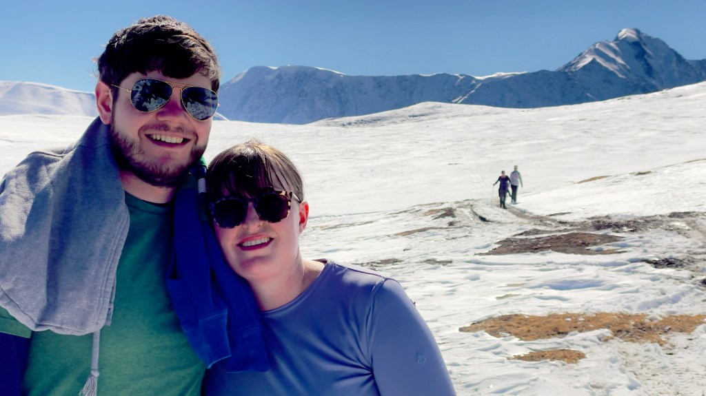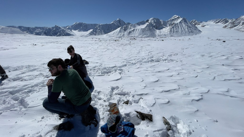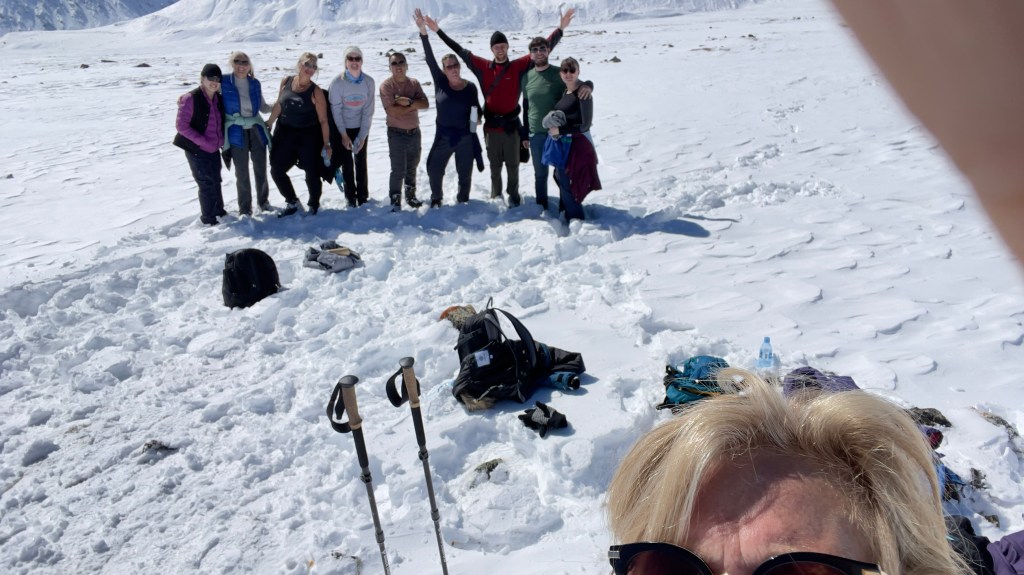 We seemed to be walking up the slopes for ages and the sun was incredibly warm. I had forgotten to take my sun cream out of my backpack when I came through customs and they had confiscated it which meant I was getting burnt to a crisp quickly as the rays of the sun were being reflected off the snow.