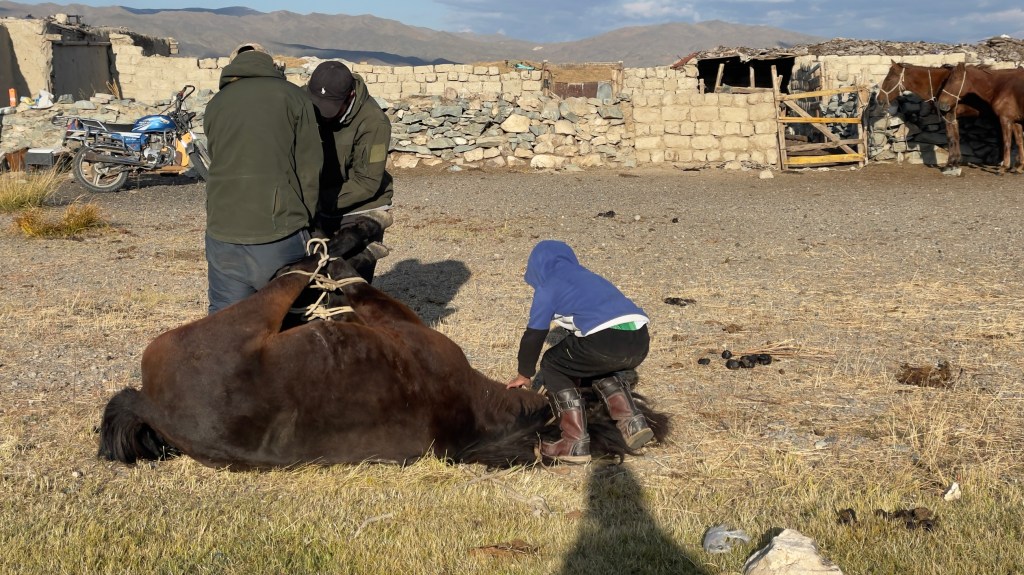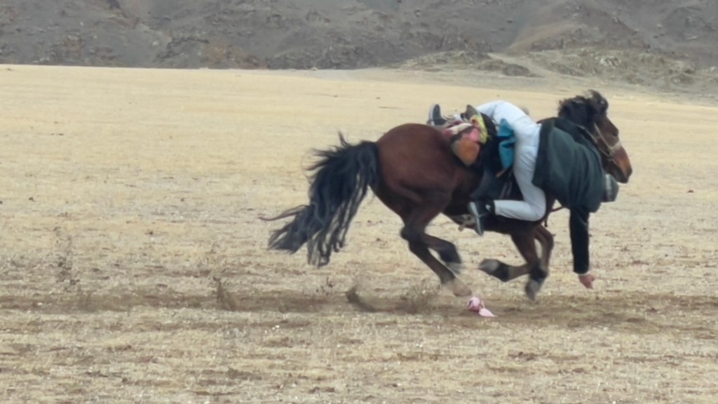 The first competition was Tenge-llu where the horse rider had to pick up a small piece of cloth from the ground while galloping at speed. Iāve no idea how they managed to remain on their horse. Sometimes they were hanging off their horse with only one foot in the stirrup.