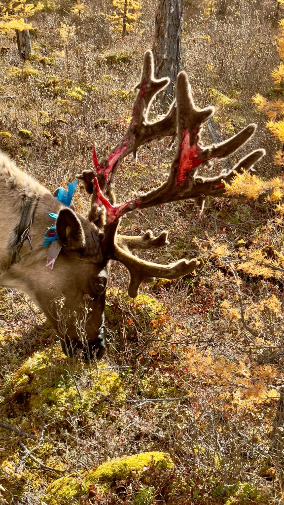 Sitting in the forest and a reindeer came strollong by more interested in the lichen than me. His antlers were beginning to shed the velvet and it looked quite raw.